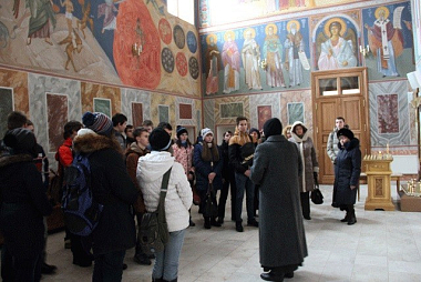 В зале гостей приветствовала настоятельница монастыря игумения Олимпиада (Баранова), рассказавшая им о традициях Русской Православной Церкви, роли святых в жизни нашей Родины и каждого человека.