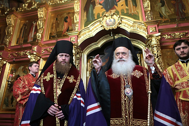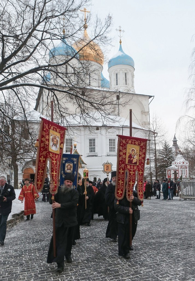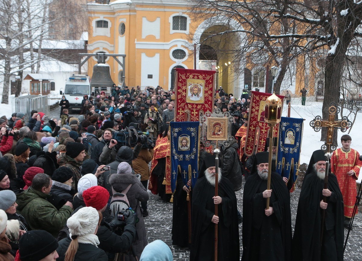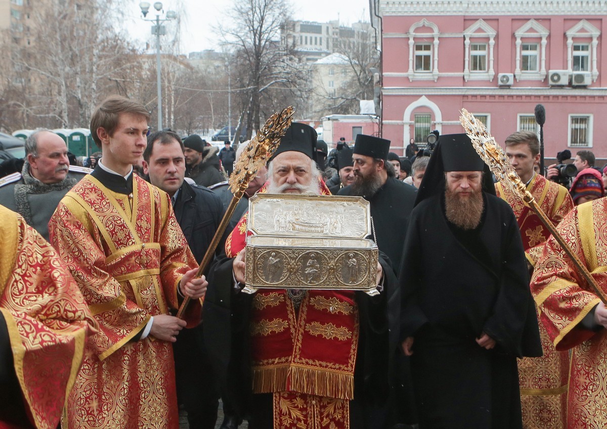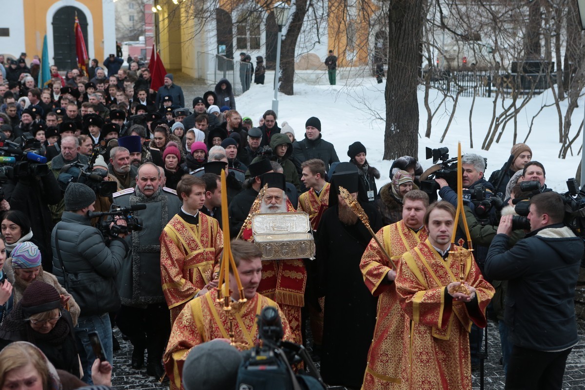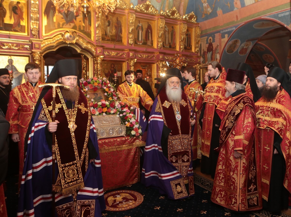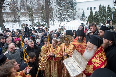 Архипастыри обменялись словами приветствия, заверив друг друга в добрых отношениях между Церквями. Затем кортеж направился в Новоспасский ставропигиальный монастырь, где святыню торжественно встретили у Святых врат братия обители с хоругвями.