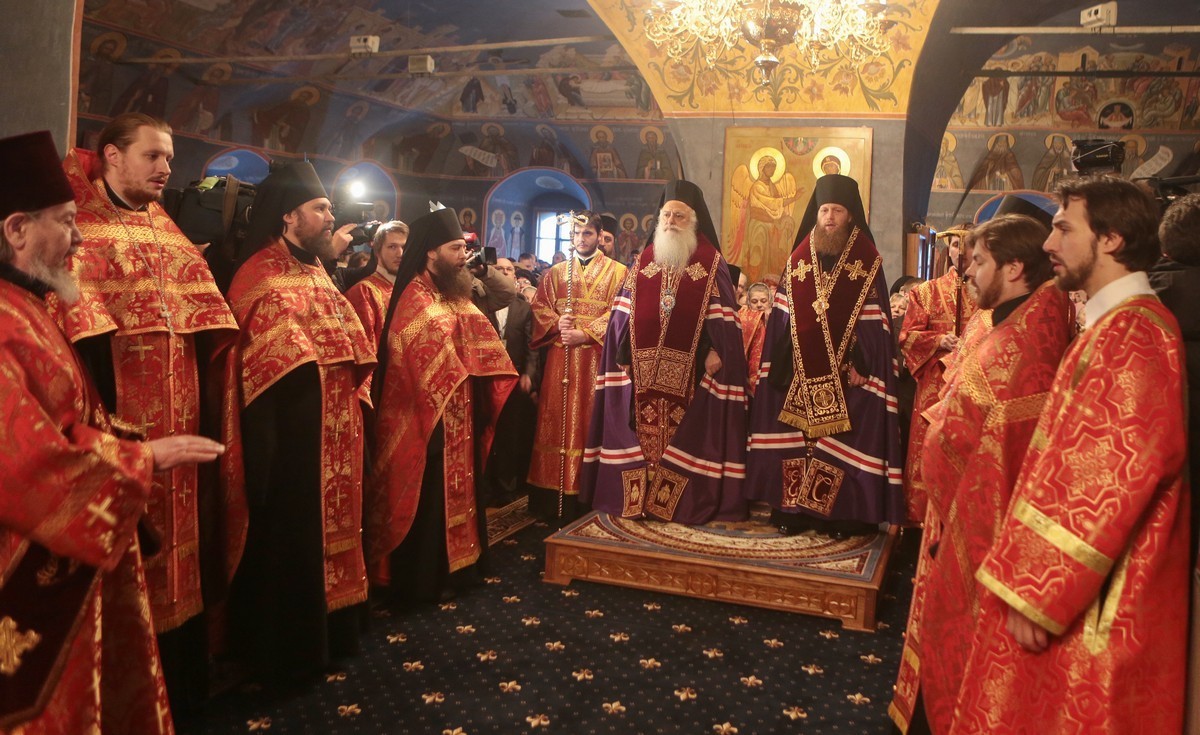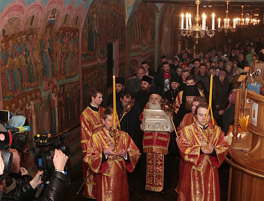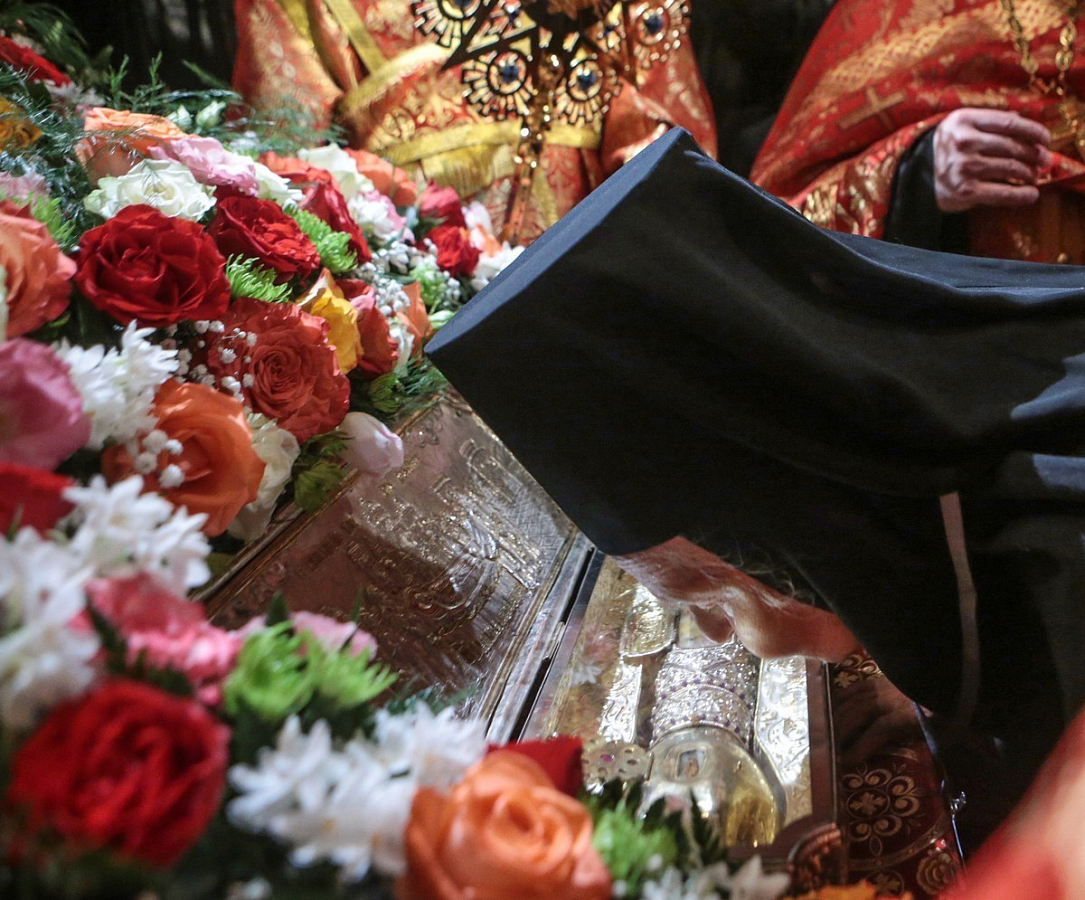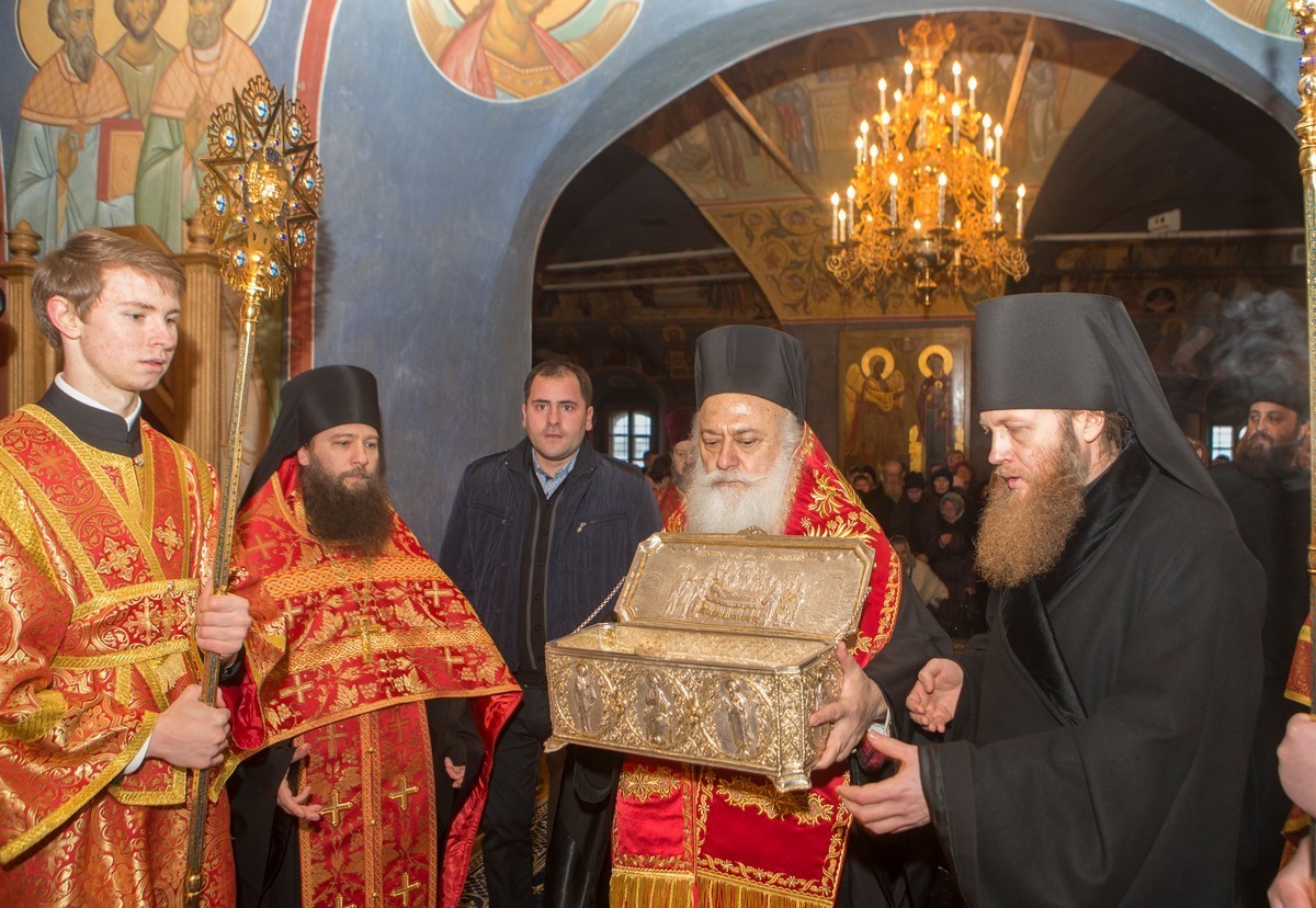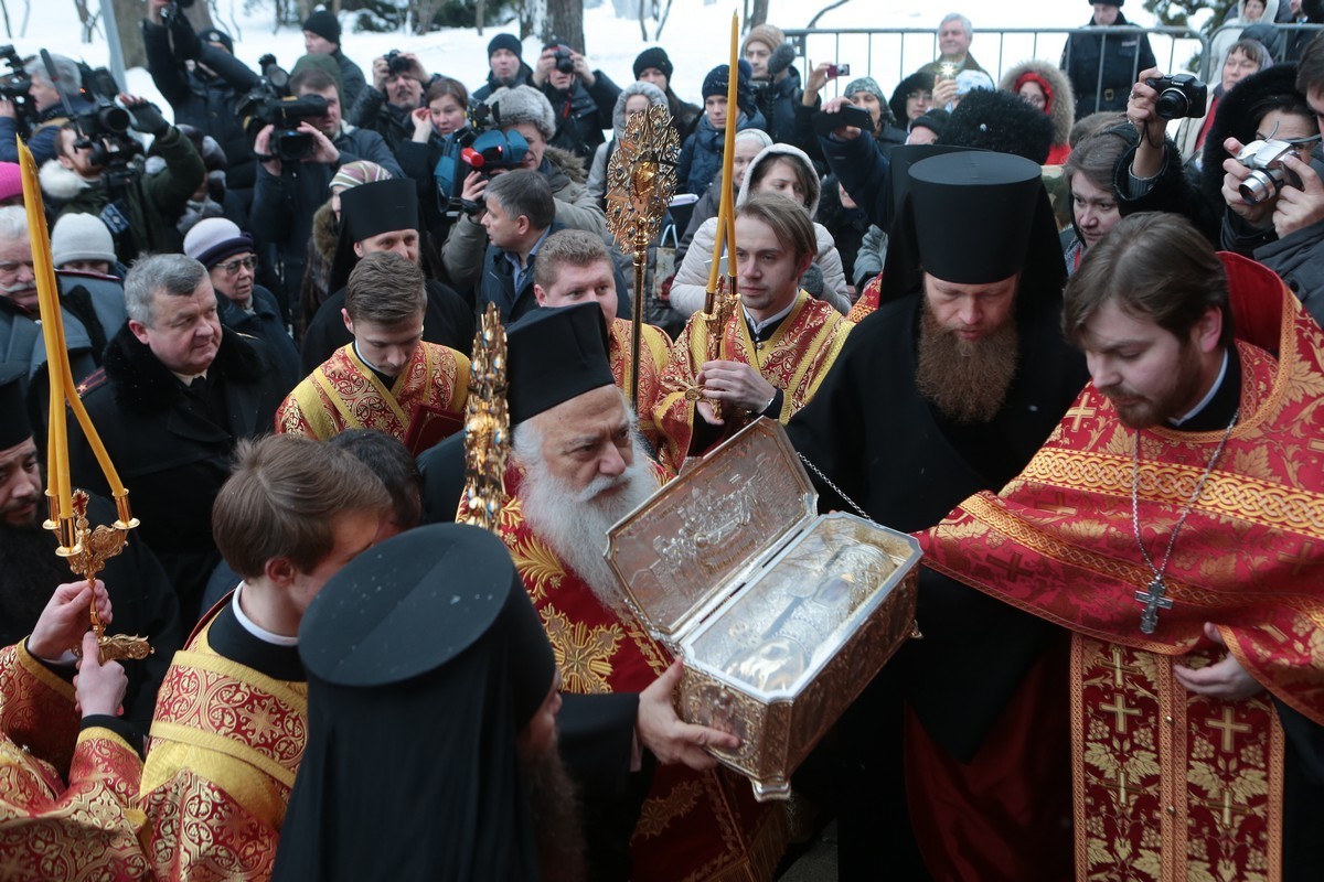 Иерархи осенили ковчегом многочисленных паломников, после чего он был торжественно внесен в монастырь. Под звуки барабанной дроби в исполнении кадетов-барабанщиков процессия двинулась к вратам храма. У входа в храмовую галерею архипастыри осенили ковчегом всю площадь, наполненную богомольцами. Затем святыня была внесена в храм Покрова Божией Матери, где сразу же начался молебен.