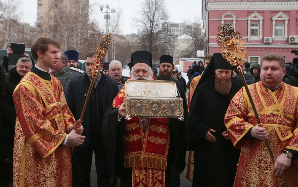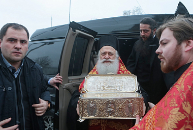 Сначала в одном из столичных аэропортов состоялась встреча святыни. Ковчег-мощевик, в котором хранится десница вмч. Димитрия, доставила делегация Элладской Православной Церкви, возглавляемая митрополитом Верии, Науссы и Кампании Пантелеимоном (Калпакидисом).
