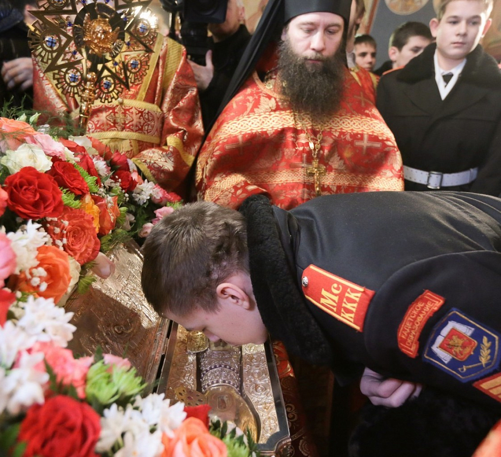 Во встрече святых мощей вмч. Димитрия Солунского, небесного покровителя воинов, участвовали воспитанники Московского казачьего кадетского корпуса имени М.А. Шолохова, воспитанники Кадетского корпуса Следственного комитета им. Александра Невского, представители Союза десантников и Воинского братства.