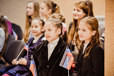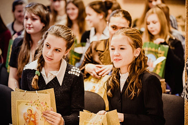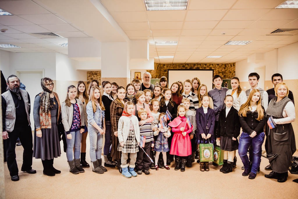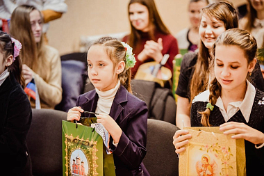 Во время встречи гостей приветствовали воспитанники Воскресной школы Донского монастыря, вручившие им сладкие подарки.