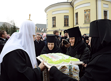 Святейший Патриарх Кирилл обратился к участникам богослужения с Первосвятительским словом. В дар обители Предстоятель передал изображение Тайной вечери, выполненное в технике русского шитья.
