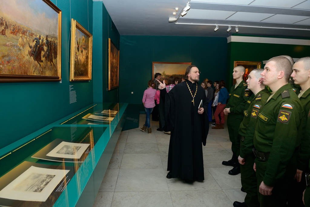 Исполняя обязанности экскурсовода, отец Никита провел воинов по залам музея, посвященным Отечественной войне 1812 года, и рассказал солдатам о представленных в них экспонатах.