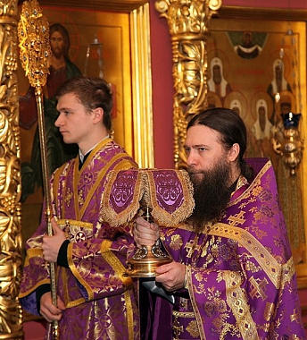 Перед Причастием иеромонах Серафим (Амельченков), секретарь первого заместителя управляющего делами Московской Патриархии, произнес проповедь, посвященную Крестопоклонной неделе и тому, что каждый человек несет свой крест и в этой жизни терпит скорби: «Для чего человеку в жизни страдания? Для того, чтобы оставаться Человеком». Свою проповедь он завершил словами о том, что каждый из нас призван к святости: «Плод наш есть святость, а конец – жизнь вечная» (Рим. 6, 22).