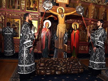 «Сегодня мы с вами слышали в песнопениях: "Днесь висит на древе, Иже на водах землю повесивый". Если вдуматься в значение Креста Христова, то для нашего человеческого понимания он некое безумие. Распинается Тот, Кто является Творцом всего, Который "на водах землю повесил", Который в руке своей содержит всю Вселенную. И мы сегодня воспоминаем Его страдания на Кресте.
