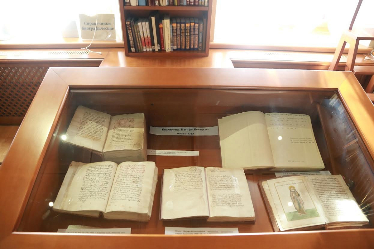 В экспозиции представлены древние Евангелия, жития преподобного Иосифа, его «Просветитель» из фондов Волоколамского монастыря, хранящиеся в РГБ.