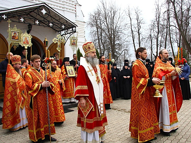 По окончании крестного хода владыка Феогност поздравил настоятельницу обители игумению Елисавету (Жегалову) с сестрами с праздником Святой Пасхи. Архиепископ Феогност и игумения Елисавета обменялись традиционными пасхальными подарками – расписными яйцами.