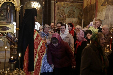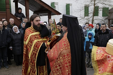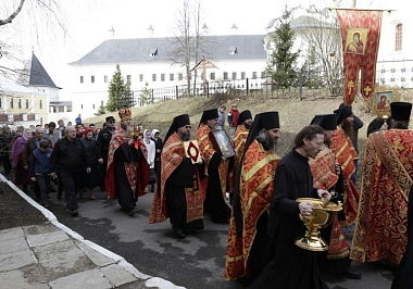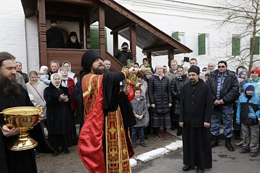 Прихожане обходили крестным ходом против часовой стрелки Рождественский собор обители. По ходу несколько раз останавливались для чтения Евангелия. Священник кропил всех святой водой. Крестный ход сопровождал праздничный колокольный звон.