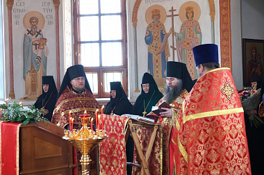Затем игумен Феофилакт зачитал поздравление в адрес игумении Марии от Святейшего Патриарха Московского и всея Руси Кирилла: