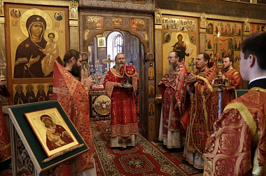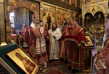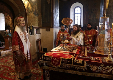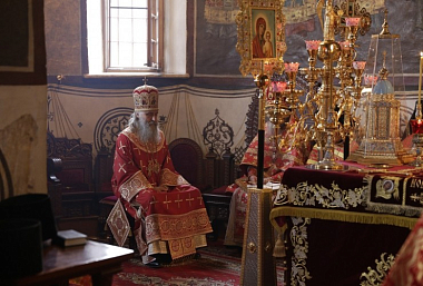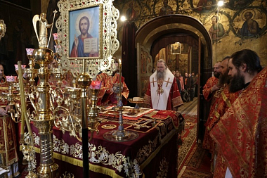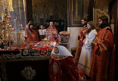 Его Высокопреосвященству сослужили: наместник Саввино-Сторожевской обители архимандрит Савва (Фатеев); духовник монастыря игумен Стефан (Гулинов); скитоначальник игумен Феодосий (Чинадель); благочинный монастыря иеромонах Кирион (Сунцов) и ризничий монастыря иеромонах Амвросий (Быков).