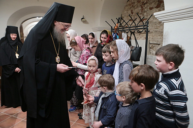 Учащиеся Воскресной школы исполнили для епископа Серафима и настоятельницы обители праздничные песнопения.