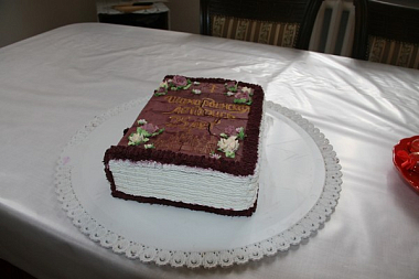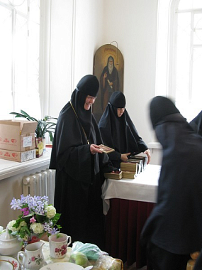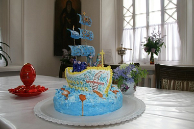 Насельницы обители, в свою очередь, поздравили игумению Сергию и монастырское духовенство и преподнесли им цветы, керамические сувениры, сделанные своими руками, и большой торт в виде корабля спасения.