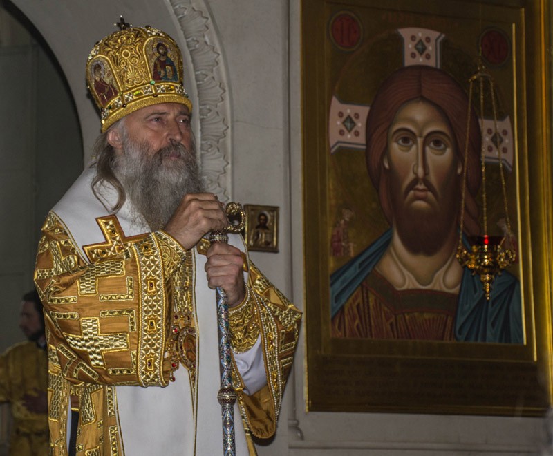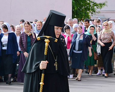 В завершение архиерейской службы был совершен крестный ход, по окончании которого архиепископ Феогност поздравил присутствующих с праздником и обратился ко всем собравшимся с архипастырским словом.