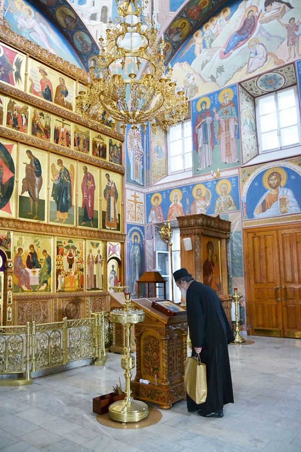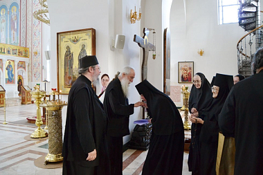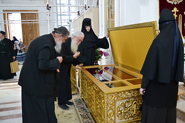 Гости поклонились святым мощам прпп. Кирилла и Марии, родителей прп. Сергия Радонежского, затем прошли в Покровский собор, где узнали сведения из жития покровителей обители и осмотрели росписи собора. В соборе святогорские отцы пропели тропарь Пресвятой Богородице «Взбранной Воеводе» на греческом языке. Также гости осмотрели территорию обители и ознакомились с историей монастыря.