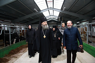 Затем архиепископ Феогност, игумения Елисавета (Жегалова) и почетные гости осмотрели территорию и оборудование новой монастырской фермы, выстроенной в этом году стараниями В.И. Даниленко. Здесь же, в здании фермы, архиепископ Феогност отслужил благодарственный молебен.