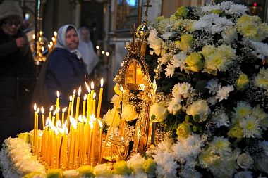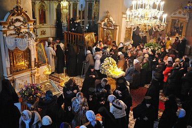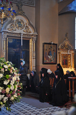 За богослужением молились игумения Иулиания (Каледа), настоятельница московского Зачатьевского ставропигиального монастыря, заместитель председателя Отдела; игумения София (Силина), настоятельница Воскресенского Новодевичьего монастыря в Санкт-Петербурге, член коллегии Отдела; игумения Филарета (Калачева), настоятельница Успенского Пюхтицкого монастыря с сестрами, насельницы Свято-Иоанновского ставропигиального монастыря в Санкт-Петербурге, прихожане Пюхтицкой обители.