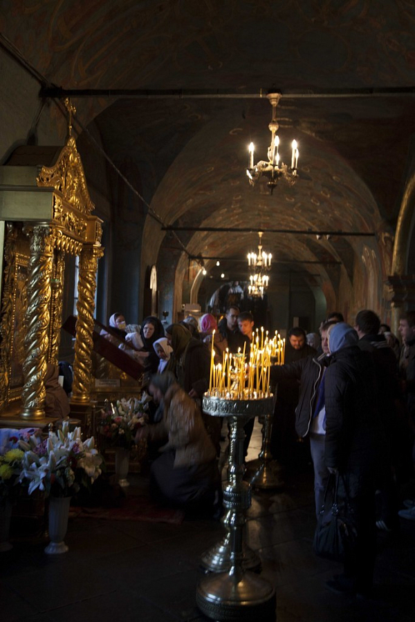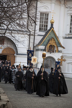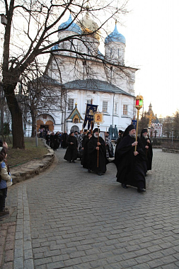 Братия обители под колокольный звон вынесла образ Толгской иконы Божией Матери из Преображенского собора и пронесла через святые врата. Многочисленные богомольцы пришли проводить чудный образ Божией Матери XVIII века.