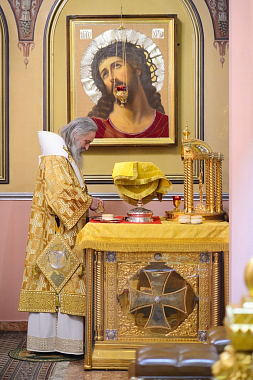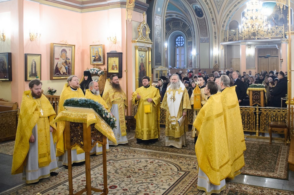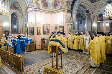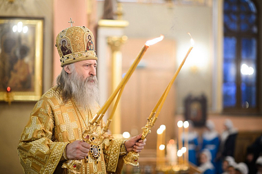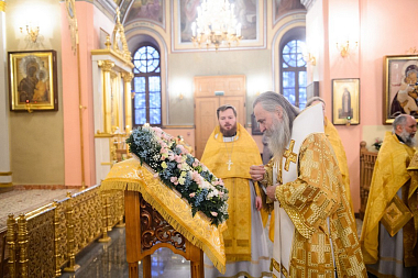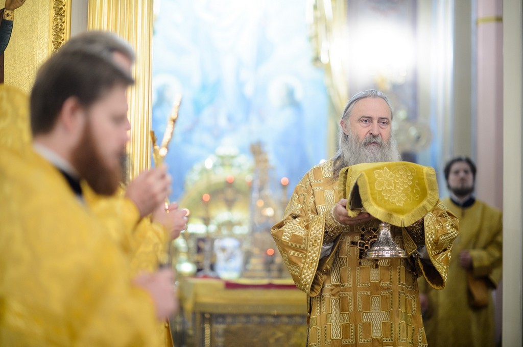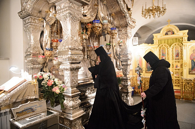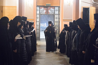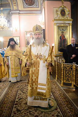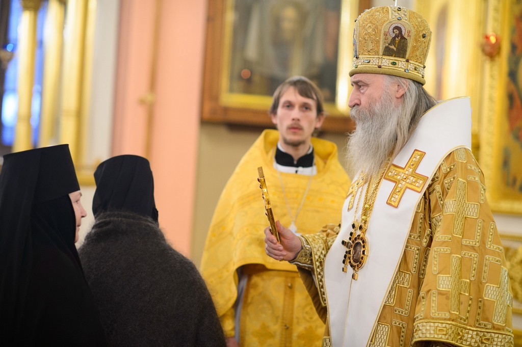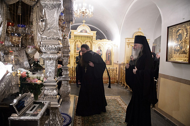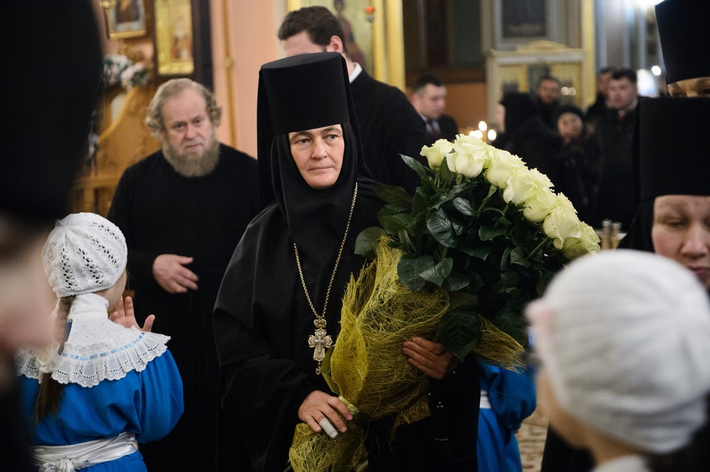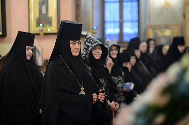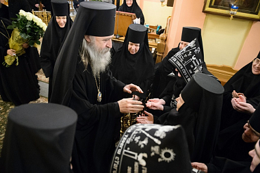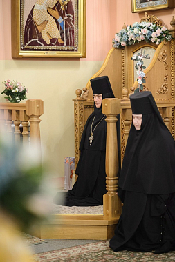 За Божественной литургией Его Высокопреосвященству сослужили заместитель председателя Синодального отдела по монастырям и монашеству архимандрит Стефан (Тараканов), клирики Покровской обители, священнослужители, приехавшие поздравить игумению Феофанию.