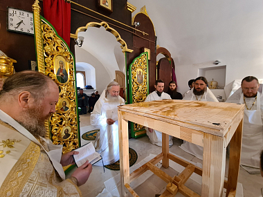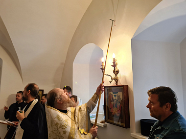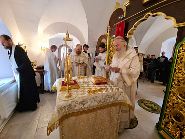 Его Высокопреосвященству сослужили: наместник Саввино-Сторожевского ставропигиального мужского монастыря архимандрит Павел (Кривоногов); благочинный ставропигиальных приходов и Патриарших подворий вне Москвы, настоятель храма прп. Сергия Радонежского на Рязанке протоиерей Виктор Сандар; настоятель Патриаршего подворья храма иконы Божией Матери «Спорительница хлебов» в п. Приазовский Темрюкского района Краснодарского края игумен Пантелеимон (Гудин); братия обители в священном сане.