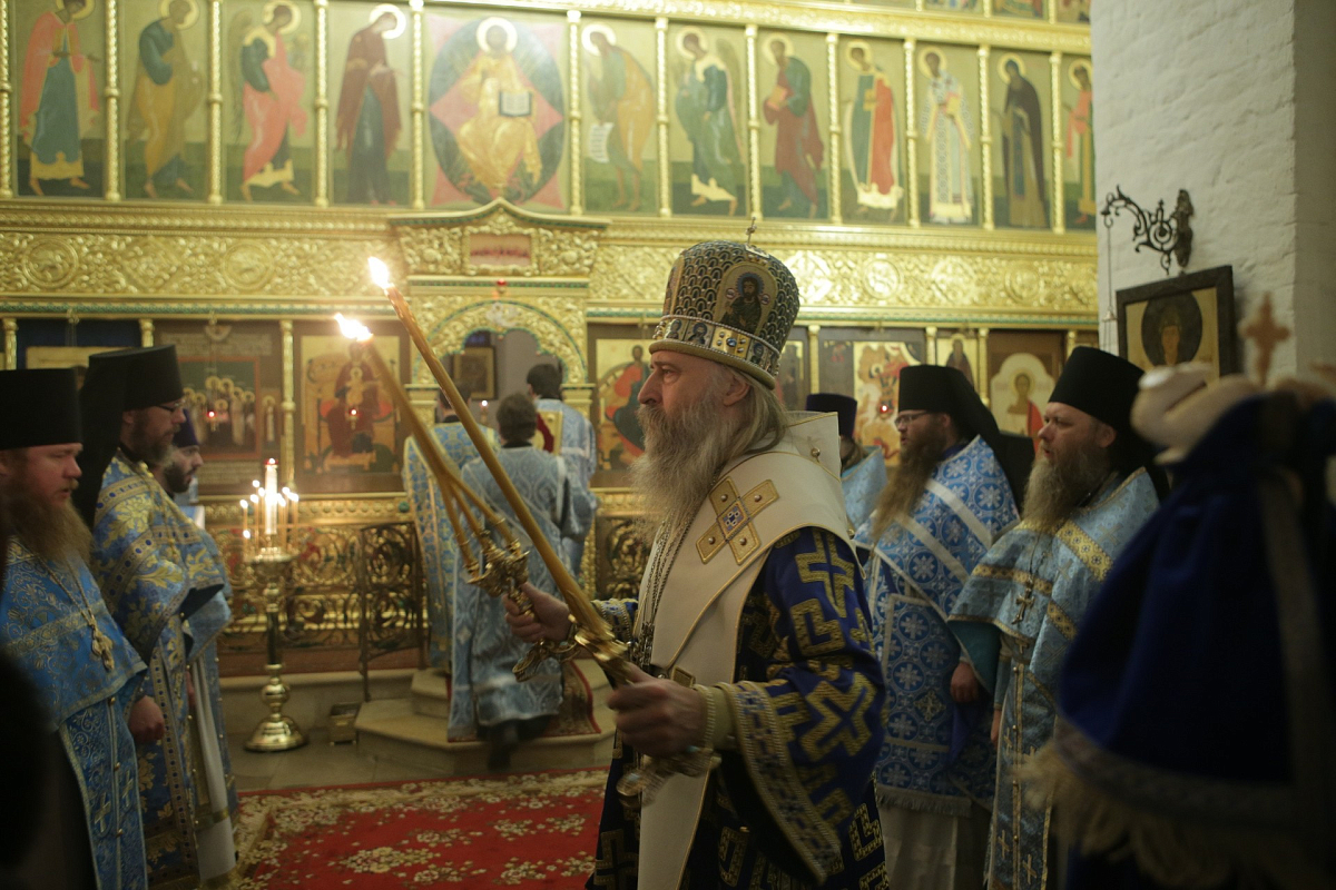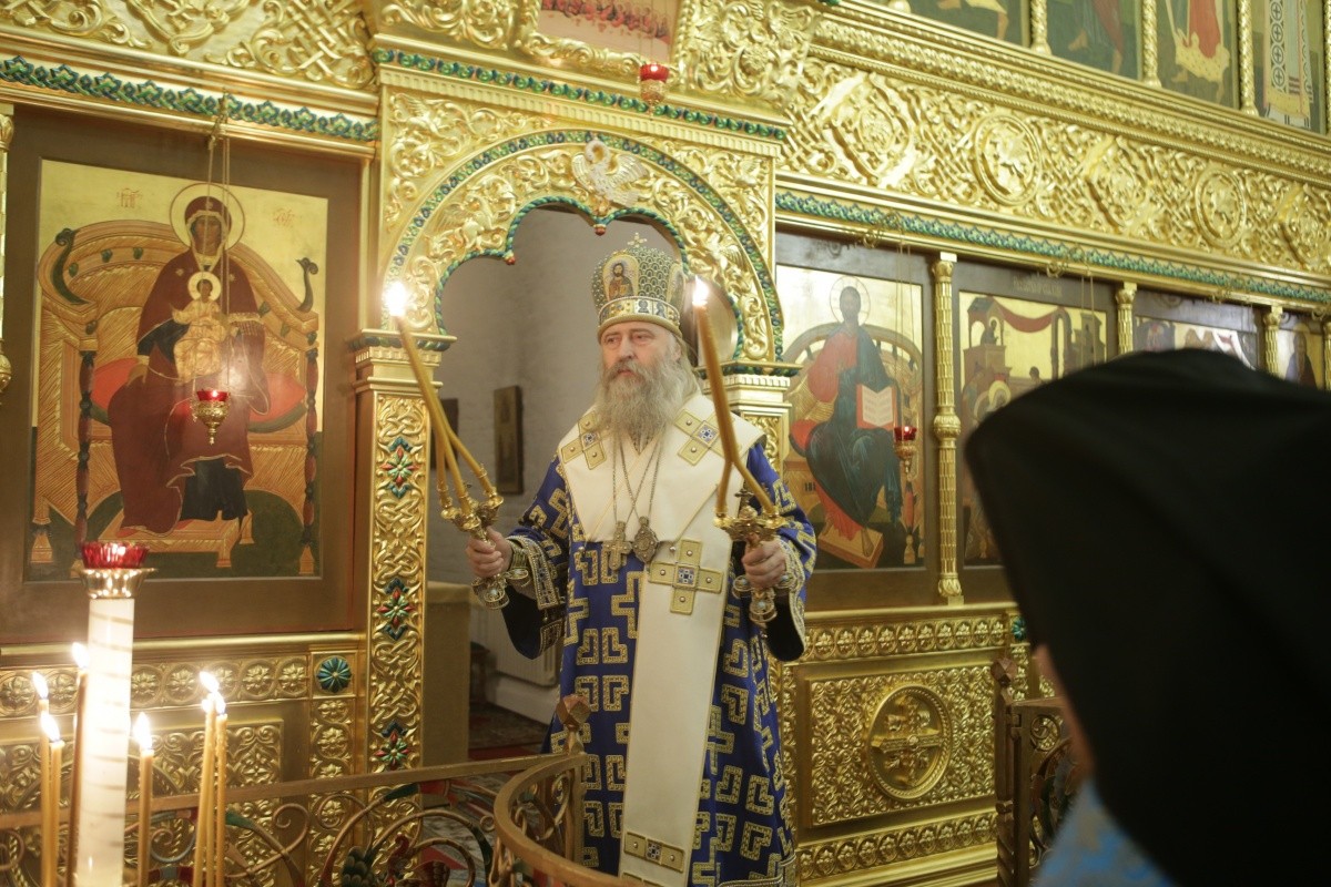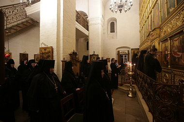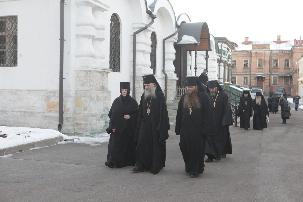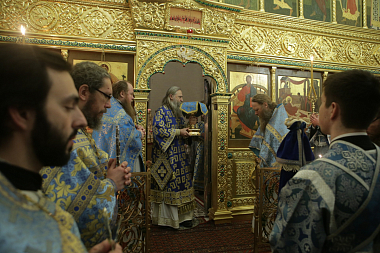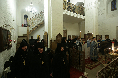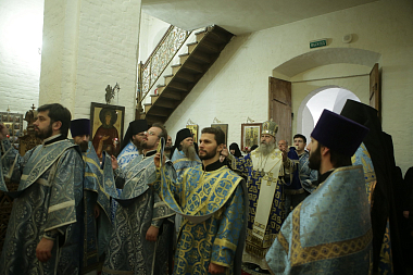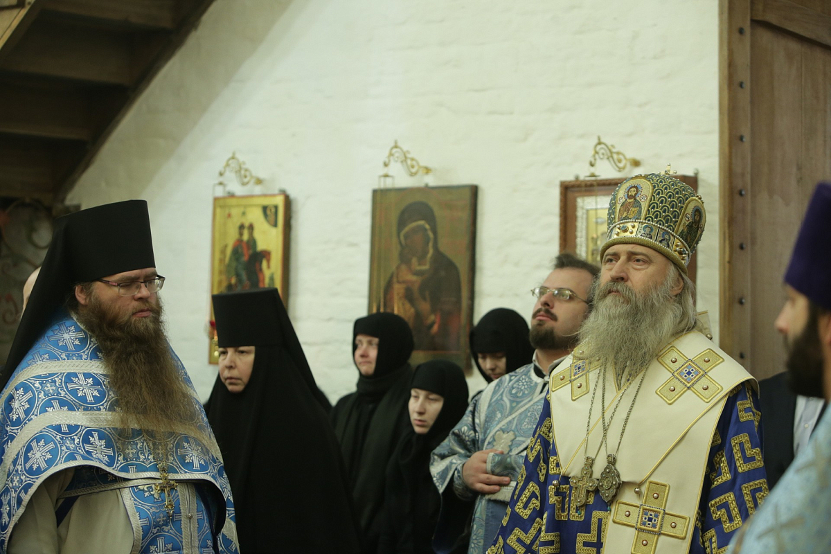 Его Высокопреосвященству сослужили наместник Спасо-Преображенского ставропигиального мужского монастыря архимандрит Порфирий (Шутов), заместитель председателя Синодального отдела по монастырям и монашеству архимандрит Стефан (Тараканов), наместник Николо-Угрешского ставропигиального мужского монастыря игумен Варфоломей (Петров), исполняющий обязанности наместника Заиконоспасского ставропигиального мужского монастыря иеромонах Даниил (Константинов), духовенство обители.