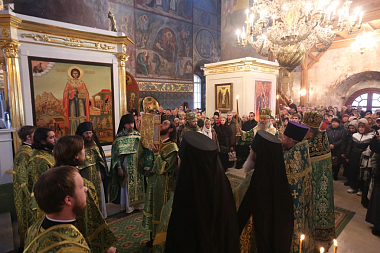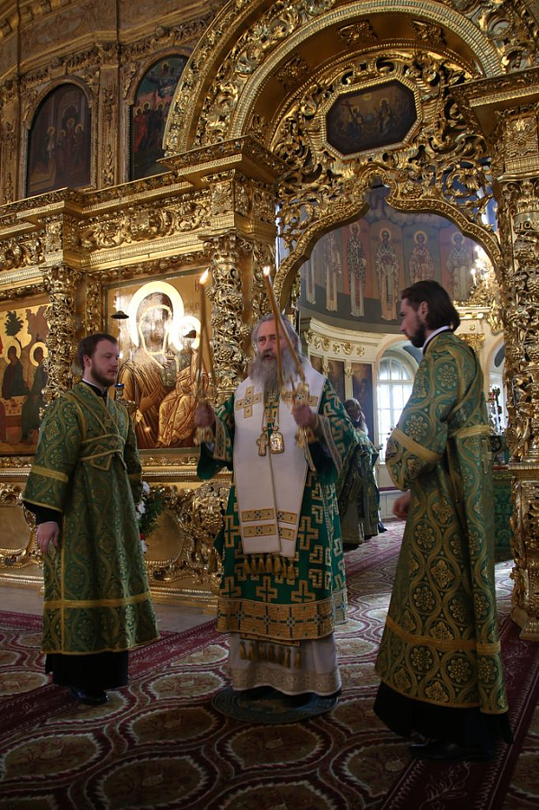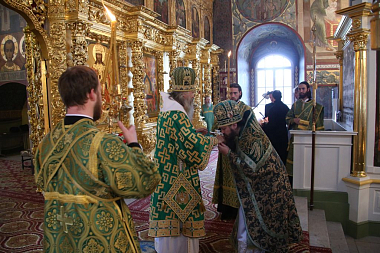 В этот день торжественное богослужение в Успенском соборе обители возглавил Председатель Синодального отдела по монастырям и монашеству архиепископ Сергиево-Посадский Феогност.