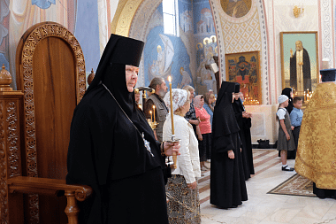 За богослужением молились настоятельница монастыря игумения Олимпиада (Баранова) с сестрами и воспитанницами монастырского пансиона, настоятельница Борисоглебского Аносина ставропигиального женского монастыря игумения Мария (Солодовникова) с сестрами, а также многочисленные гости и прихожане обители.