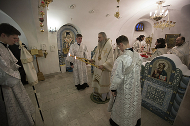Его Высокопреосвященству сослужили: благочинный обители Преподобного Сергия архимандрит Павел (Кривоногов); настоятель пустыни Святого Параклита подворья Троице-Сергиевой лавры архимандрит Лука (Ионов); настоятель храма в честь Явления Пресвятой Богородицы преподобному Сергию Радонежскому лаврского подворья иеромонах Феофилакт (Кириллов); лаврский ризничий иеромонах Сильвестр (Кучеренко) и прочая монастырская братия в священном сане; клирики храма.