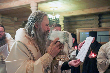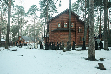 Всех вас поздравляю с праздником. Сегодня по благословению Святейшего Патриарха Кирилла совершено великое освящение этого дивного храма. Матушка игумения, радуемся за Вас. Когда-то здесь была трапезная, а сегодня здесь совершается трапеза духовная. Этот храм как малая община, где можно во всякое время без лишних формальностей собраться и помолиться Господу... Всех вас благодарим за святые молитвы. Причастников поздравляем с принятием Святых Христовых Таин».