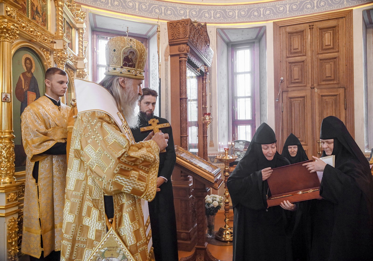 Затем игумения Мария поздравила владыку Феогноста с 60-летним юбилеем со дня рождения и преподнесла ему в подарок напрестольный крест.