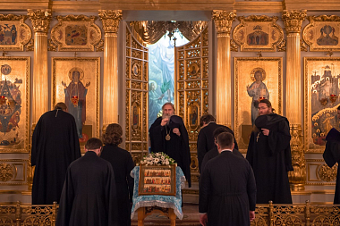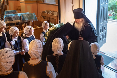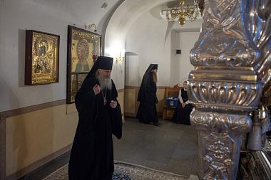 Его Высокопреосвященство встретила настоятельница Покровского монастыря игумения Феофания (Мискина) с сестрами обители и сопроводила в Покровский храм поклониться мощам святой праведной блаженной Матроны Московской.
