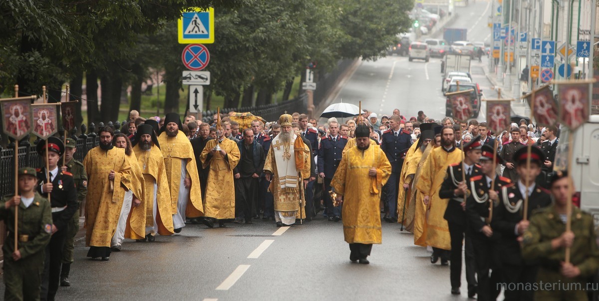 Затем из храма вышел крестный ход, который направился к вратам обители, выходящим на Петровский бульвар. Основная часть работ по их восстановлению завершилась накануне праздника. Духовенство и миряне обошли монастырь с хоругвями и пением молитвы. По традиции главную святыню монастыря – ростовую икону первого московского митрополита святителя Петра – несли участники братства «Сыны Афона».