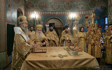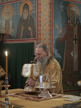 В сам день праздника перед началом Литургии казначей монастыря иеромонах Никандр (Стогний) отслужил молебен с водосвятием митрополиту Петру.