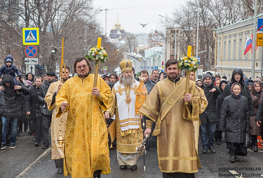 По окончании Литургии, по традиции, по близлежащим улицам вокруг Высоко-Петровского монастыря проследовал крестный ход. Из обители была изнесена ростовая чтимая икона святителя Петра, которую несли члены братства «Сыны Афона». Детские хоругви с ликом святителя Петра и Петровской иконы Божией Матери пронесли воспитанники Воскресной школы Высоко-Петровского монастыря.