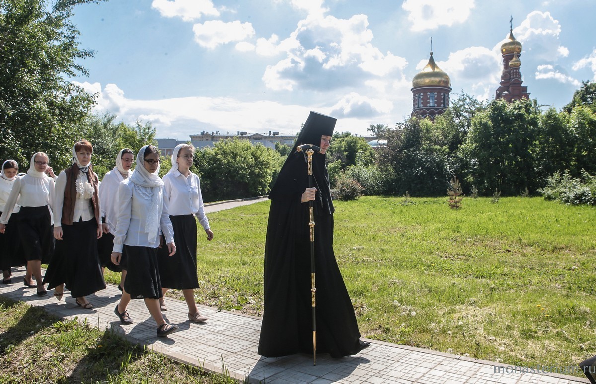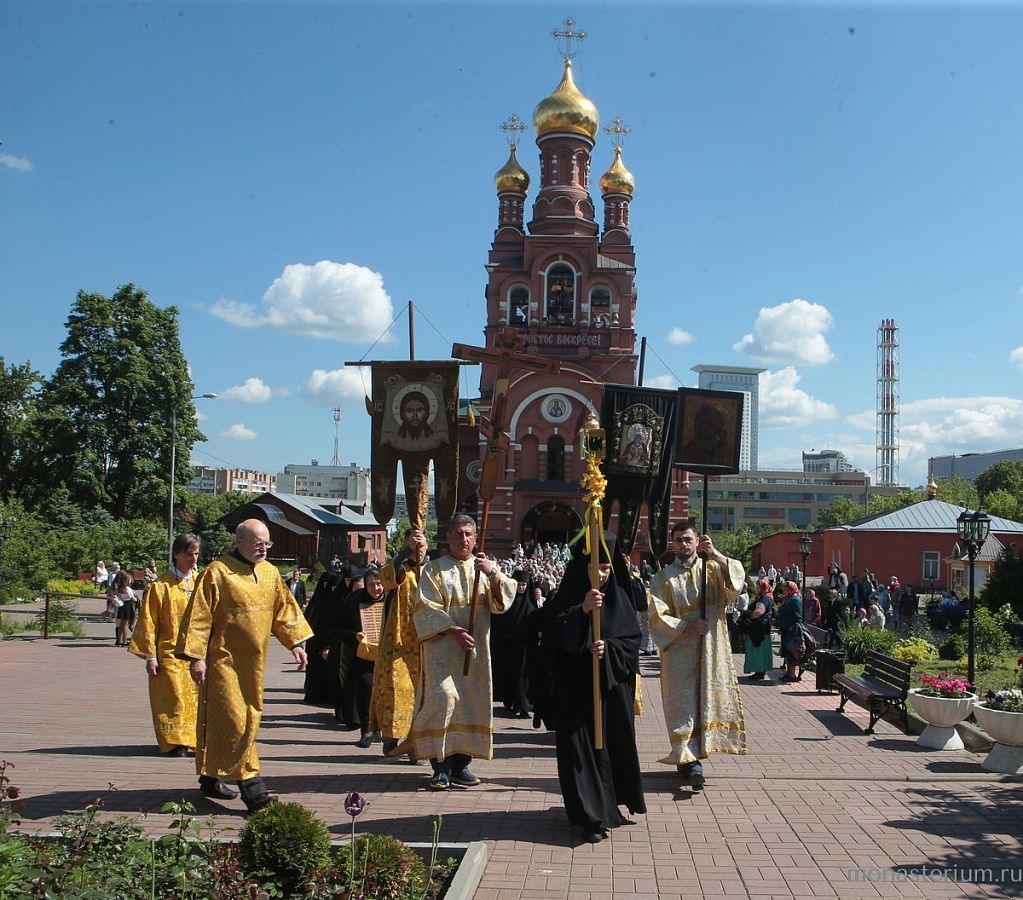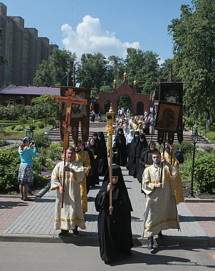 По окончании богослужения состоялся праздничный крестный ход с Крестом и хоругвями. Владыка Феогност, настоятельница Алексеевской обители игумения Ксения с сестрами, духовенство, прихожане обители прошли с пением праздничных тропарей по дорожке вдоль монастырских стен.