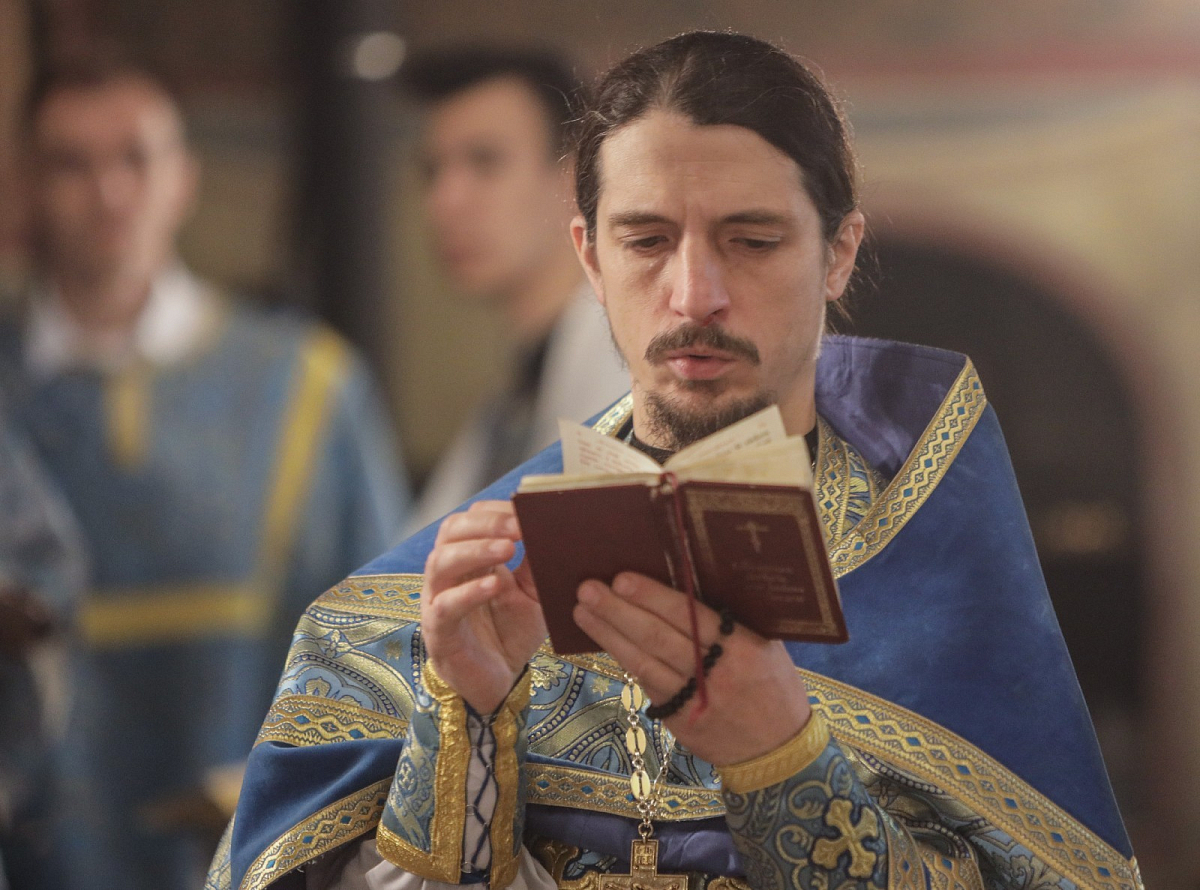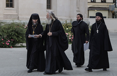 Перед богослужением архиепископа Феогноста встретил наместник Сретенской обители иеромонах Иоанн (Лудищев) с братией.
