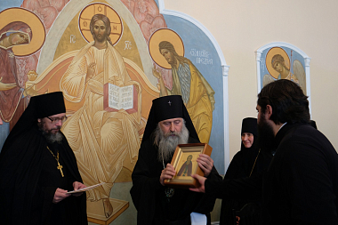 В завершение архиепископ Феогност от лица Патриарха Московского и всея Руси Кирилла поздравил иеромонаха Даниила с днем тезоименитства и вручил ему памятный дар – икону прп. Сергия Радонежского.