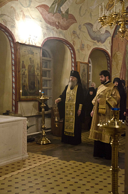 Перед началом богослужения Владыка совершил заупокойную литию по приснопамятному архимандриту Петру (Афанасьеву), бывшему наместником Заиконоспасского ставропигиального мужского монастыря и духовником и строителем Акатовской обители.