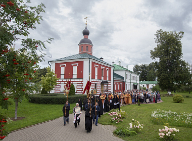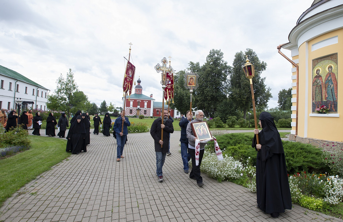 По заамвонной молитве архиепископ Феогност возглавил праздничный крестный ход по территории обители, в ходе которого владыка и священнослужители обители окропили богомольцев святой водой, а по окончании которого вознесли молитву к святым благоверным князьям и страстотерпцем Борису и Глебу.