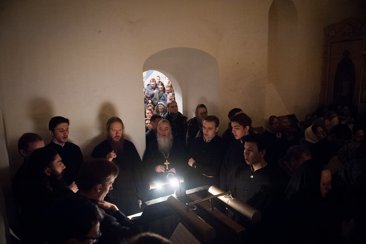 Церковные песнопения Знаменным распевом исполнил братский хор Лавры под управлением иеромонаха Никифора (Исакова).