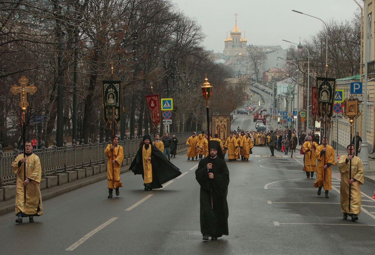 По окончании Литургии начался крестный ход вокруг обители. Множество прихожан и паломников прошло большим крестным ходом вокруг исторической территории Высоко-Петровского монастыря: по Петровскому бульвару, улице Петровке и Крапивенскому переулку. Крестным ходом была пронесена главная святыня обители – ростовая икона покровителя Москвы святителя Петра с частицей его святых мощей.