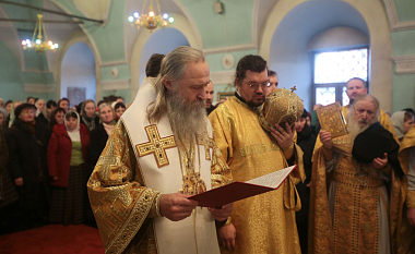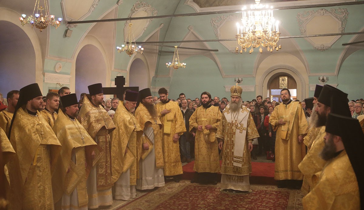 Богослужение возглавил наместник Высоко-Петровского монастыря игумен Петр (Еремеев). Отцу наместнику сослужила братия в священном сане.