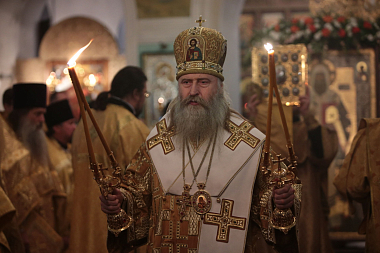 После крестного хода владыка Феогност поздравил от имени Святейшего Патриарха Московского и всея Руси Кирилла богомольцев с престольным праздником обители и обратился к молящимся с архипастырским словом.