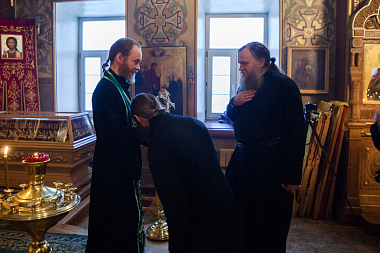 В завершение архиепископ Феогност совместно с епископом Троицким Панкратием, наместником Спасо-Преображенского Валаамского монастыря, провели собеседование с десятью послушниками Валаамской обители, желающими принять иноческий постриг.