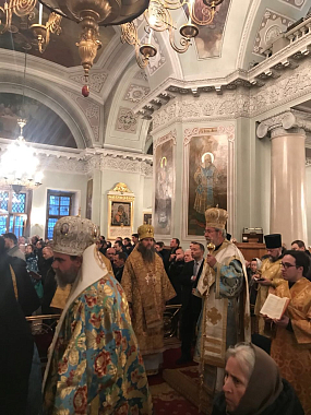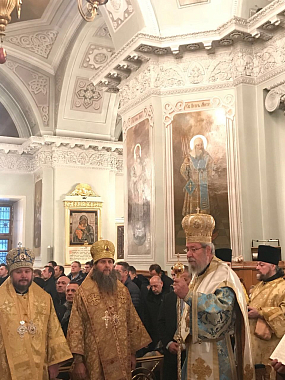 Его Блаженству сослужили митрополит Архангельский и Холмогорский Даниил, митрополит Тамасосский и Оринийский Исаия, епископ Шахтинский и Миллеровский Симон, наместник монастыря архимандрит Алексий (Поликарпов), духовенство обители и члены делегации Кипрской Церкви в священном сане.