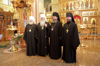 За Божественной литургией Блаженнейшему владыке сослужили: митрополит Ханты-Мансийский и Сургутский Павел, архиепископ Элистинский и Калмыцкий Юстиниан, епископ Санта-Розский Даниил, благочинный Сергиевского округа г. Москвы протоиерей Анатолий Алефиров, настоятель Казанского собора на Красной площади протоиерей Николай Иноземцев, протоиерей Даниил Андреюк (Православная Церковь в Америке), насельники подворья в священном сане.
