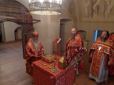 Его Преосвященству сослужили: Председатель Отдела религиозного образования и катехизации г. Москвы, настоятель храма Святого пророка Божия Илии в Северном Бутове иеромонах Онисим (Бамблевский); благочинный монастыря игумен Никон (Жиганов); протодиакон Владимир Назаркин; духовенство г. Москвы.