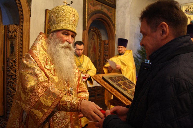 Преосвященный Владыка поздравил с 75-летием духовника обители иеромонаха Георгия (Мысовского), а также поздравил с праздником Рождества Христова присутствовавшие на богослужении семьи священнослужителей и вручил супругам клириков букеты цветов, а детям сладкие рождественские подарки.