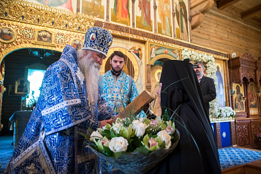 На память о сем высокоторжественном дне настоятельница обители вручила владыке Феофилакту икону святого праведного Лазаря, епископа Китийского, большая частица мощей которого имеется в Богородице-Рождественском соборе монастыря, и букет цветов.