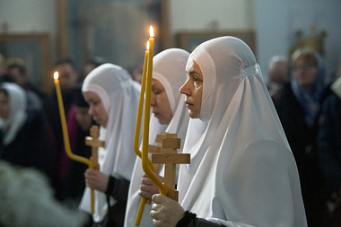 По окончании богослужения председатель Синодального отдела по благотворительности поздравил сестер с этим торжественным событием: